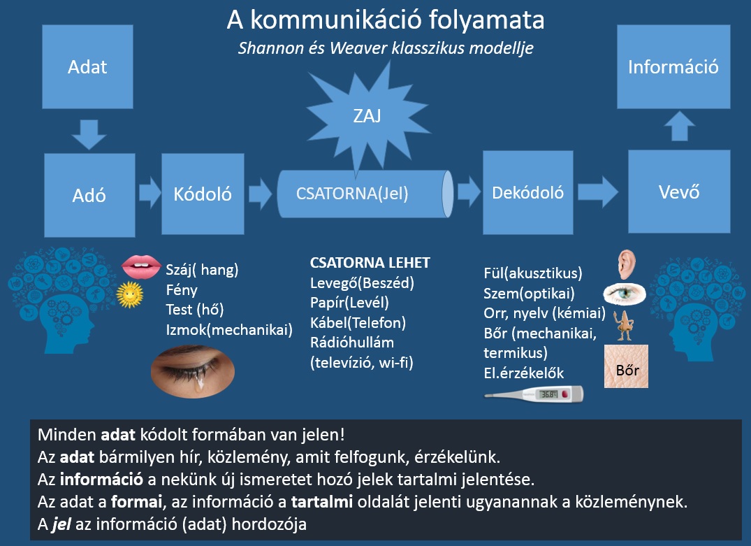 A fenti képen a kommunikáció folyamata látható. ha letöltötted a prezentációt akkor már találkoztál az ábrával. A következő három feladatban megvizsgáljuk az adatok megbízhatóságát (validitás-1), megnézük a zaj milyen hatással van a csatornára(2) illetve dekódoljuk a jeleket, hogy információhoz(3) juthassunk.